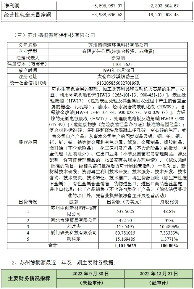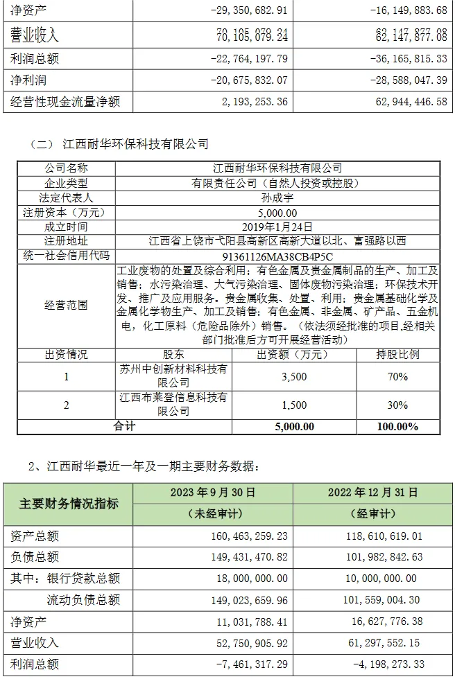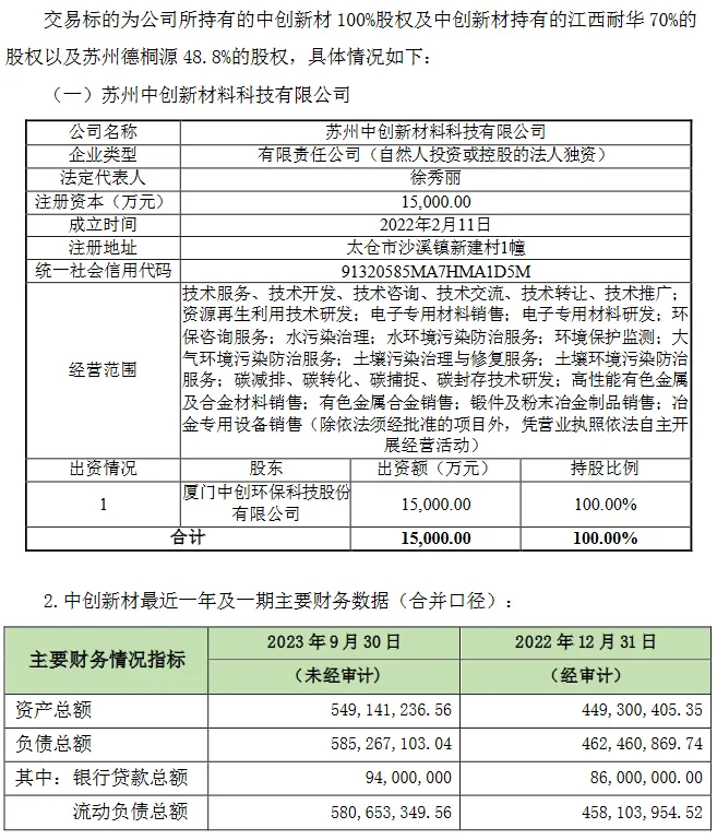 公告顯示,廈門(mén)中創(chuàng)環(huán)??萍脊煞萦邢薰荆ㄒ韵潞?jiǎn)稱(chēng)“中創(chuàng)環(huán)保”)擬籌劃轉(zhuǎn)讓所持有的蘇州中創(chuàng)新材料科技有限公司(以下簡(jiǎn)稱(chēng)“中創(chuàng)新材”)100%股權(quán)。中創(chuàng)新材分別持有江西耐華環(huán)??萍加邢薰荆ㄒ韵潞?jiǎn)稱(chēng)“江西耐華”)70%的股權(quán),蘇州德桐源環(huán)??萍加邢薰?更名前名稱(chēng):蘇州順惠有色金屬制品有限公司,已于 2024 年 4 月 1 日更名,以下簡(jiǎn)稱(chēng)“蘇州德桐源”)48.8%的股權(quán)。