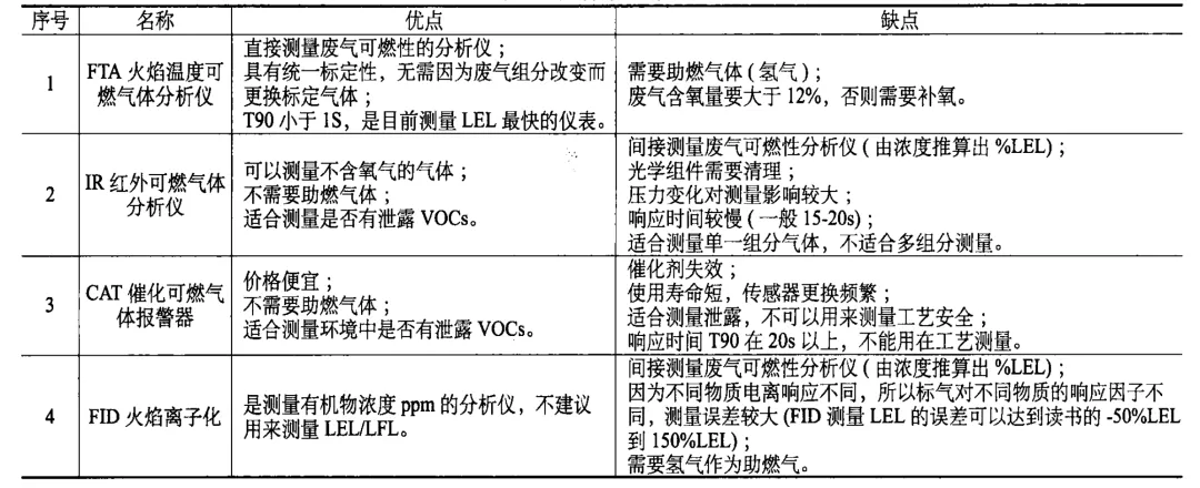 在VOCs焚燒系統(tǒng)中,如RTO、RCO、CO、TO等VOCs焚燒系統(tǒng),其中LEL檢測儀(測量VOCs的廢氣濃度的儀表)檢測的精度及反應(yīng)時(shí)間至關(guān)重要。精度太差,不能測出廢氣管道內(nèi)VOCs的實(shí)際濃度,則LEL檢測儀形同虛設(shè);反應(yīng)時(shí)間太長,則不能及時(shí)切斷閥門,所以,在合理確定LEL檢 測儀安裝位置,確保充足的過程安全時(shí)間,防止?jié)舛瘸逇怏w進(jìn)入VOCs處理設(shè)施的同時(shí),必須確保LEL檢測儀響應(yīng)時(shí)間足夠短。目前,在化工等安全要求較高的企業(yè),越來越多的企業(yè)推薦使用FTA或FID原理LEL檢測儀。這類檢測儀檢測精度高,反應(yīng)時(shí)間快,能夠滿足企業(yè)需求。不少大化工企業(yè)對LEL的配置還采取了“3選2的模式”,即配置這個(gè)就接近100萬元,但安全大于天,值得有條件的企業(yè)參考學(xué)習(xí)。下面我門來看看市面上關(guān)于LEL儀表的集中類型,如FTA火焰溫度可燃?xì)怏w分析儀、IR 紅外可燃?xì)怏w分析儀、CAT 催化可燃?xì)怏w報(bào)警器、FID 火焰離子化。為方便比較,做了優(yōu)缺點(diǎn)對比表如下: